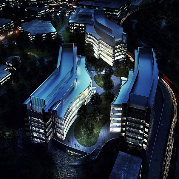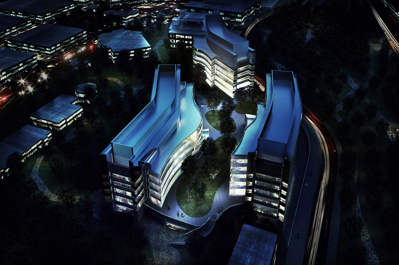 Captions: 01: Exterior rendering, 02: Aerial rendering at night