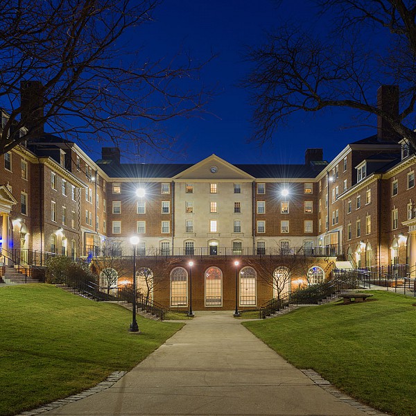 Description: This design-build residence hall project comprises the comprehensive, phased renovation of two low-rise, historic dormitory buildings and the partial renovation of a third dormitory building totaling approximately 72,000 sf. The design of a new central hot water plant for the complex consists of a shell-&-tube steam-to-water heat exchanger and two primary hot water circulating pumps with variable frequency drives (VFDs) connected to generator power. Hot water is distributed from the hot water pumps via an insulated piping distribution system to perimeter radiation, ventilation and heat recovery unit, and miscellaneous heating units throughout the building. Mechanical supply ventilation is provided for the corridors and other occupied areas where natural ventilation cannot be provided, and ventilation for bathrooms and trash rooms will be provided mechanically by an energy recovery ventilation unit. Additional systems include a new water meter and reduced pressure backflow preventer, two new hot water sources, electrical service with a new 120/208-volt three-phase four-wire 400 ampere feeder, and new high-efficiency lighting.