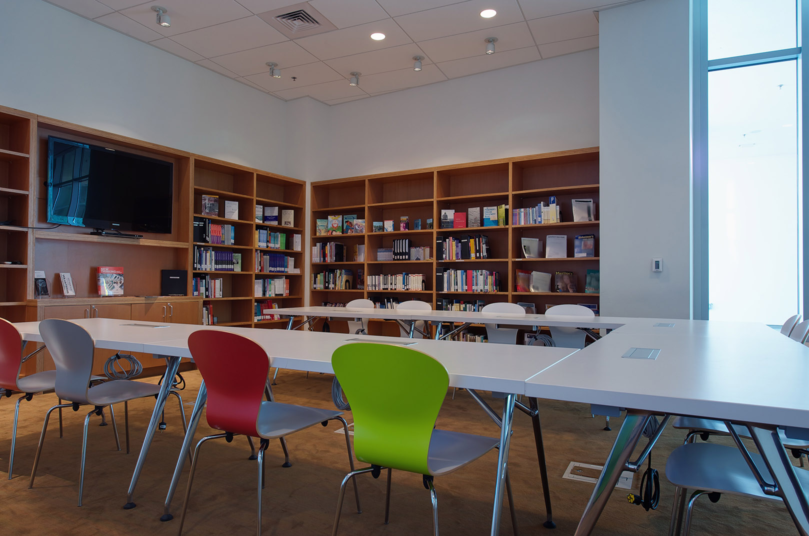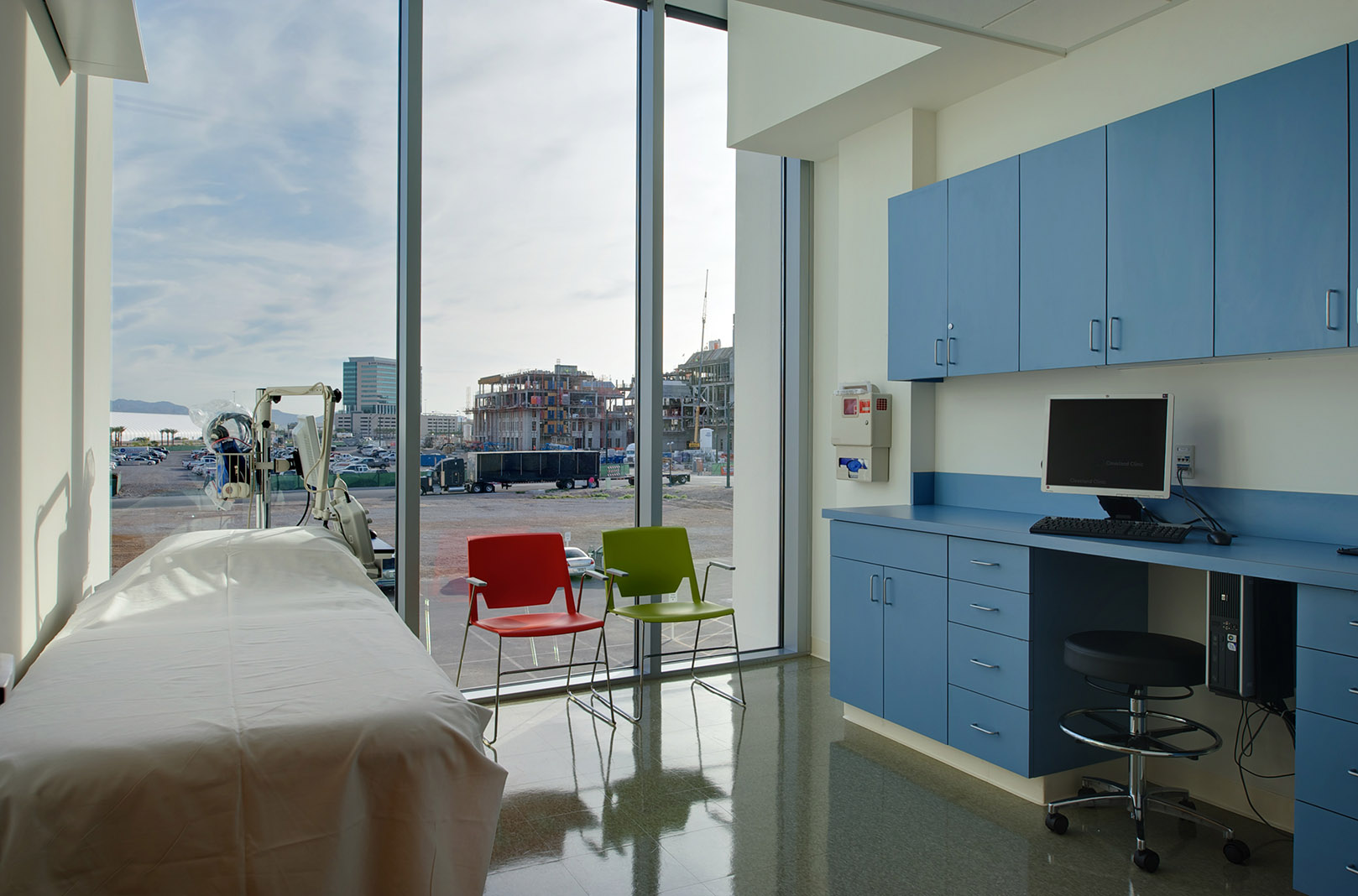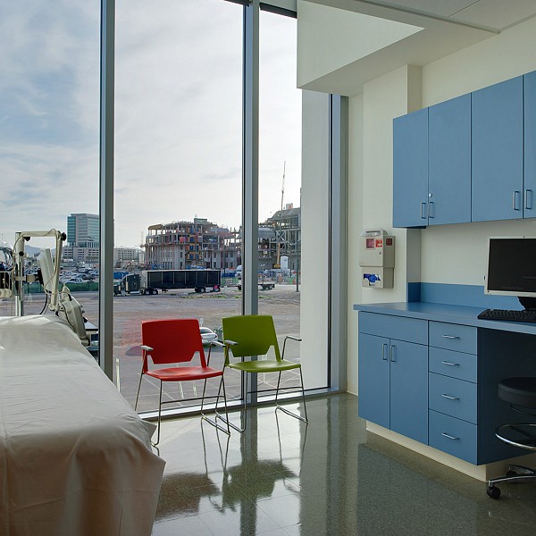 Captions: 01: Exterior, 02: Exterior in the evening, 03: Entry view, 04: Plaza, 05: Exterior detail, 06: Gathering space, 07: Patient room, 08: Elevator lobby, 09: Reception, 10: Interior detail, 11: Reading room, 12: Workspace