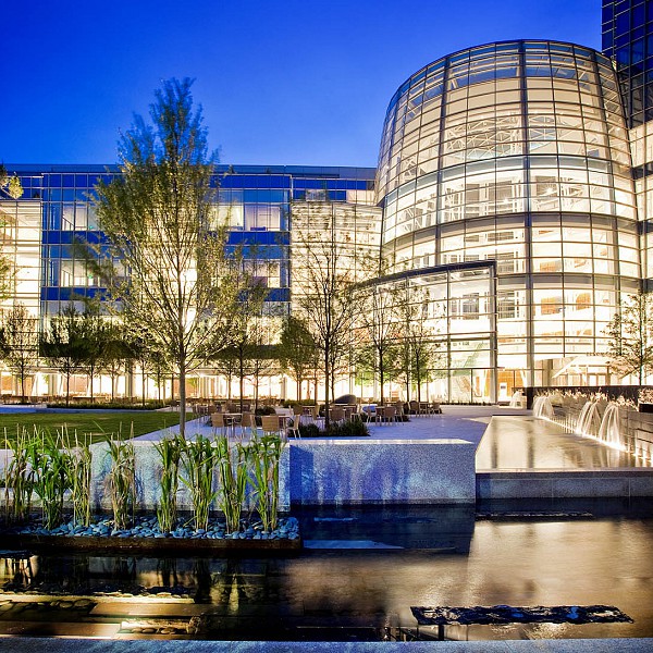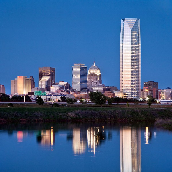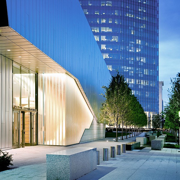 Captions: 01: Evening and the Oklahoma City Skyline, 02: Exterior, 03: Exterior view of atrium, 04: Entry view