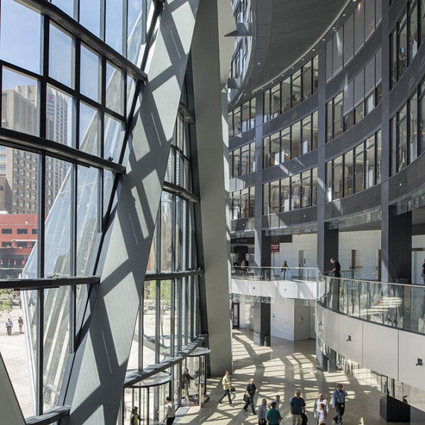 Description: The Bow was named in reference to the nearby Bow River and in recognition of the tower’s curving facade.  The project is 59 stories high and has a gross area of 2,000,000 sf, including 800,000 sf of parking. Cosentini proposed and designed an underfloor air distribution system using air tower units, underfloor fan-powered boxes, and floor-mounted swirl diffusers to address energy efficiency, occupant comfort, and a substantial reduction in total cost of ownership for the client.   Other major features included the application of heat recovery systems, installation of high-efficiency electrical chillers with variable speed drives, free cooling using plate and frame heat exchangers, installation of high-efficiency boilers, integrated building management and control systems, and daylighting.