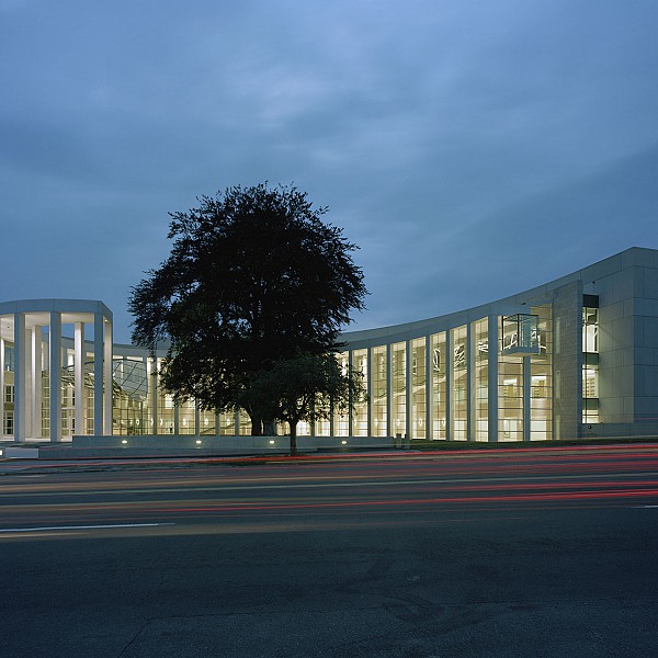 Description: This new 162,000 sf courthouse includes three US District Courtrooms, one US Magistrate Courtroom, and one Bankruptcy Courtroom, with adjunct facilities and judges' chambers, jury assembly, probation, the US Marshal’s office, the US Attorney’s office, the Congressional office, building support offices, related rooms and spaces, and expansion capability for one additional courtroom. The courthouse contains four courtrooms that form a spiralling cresent around three heritage trees ranging in age from 200 to 500 years. The courthouse features curved glass walls with minimal framing, limestone walls with large openings, and an inner wall.