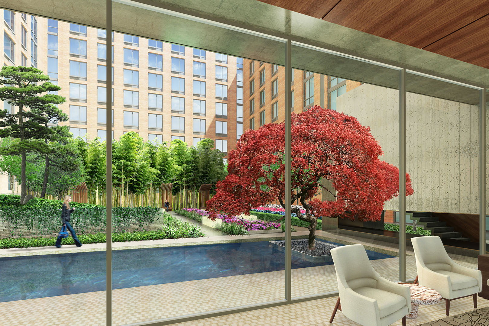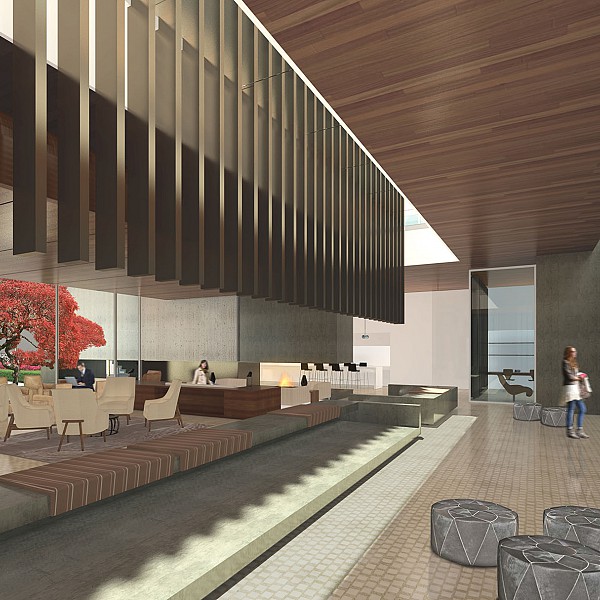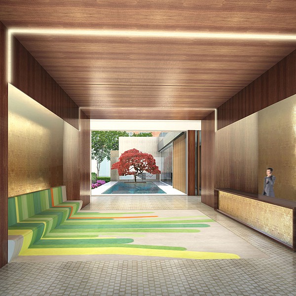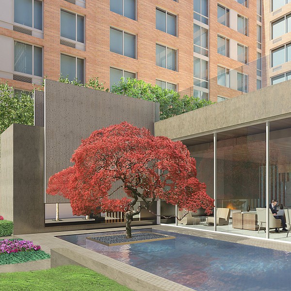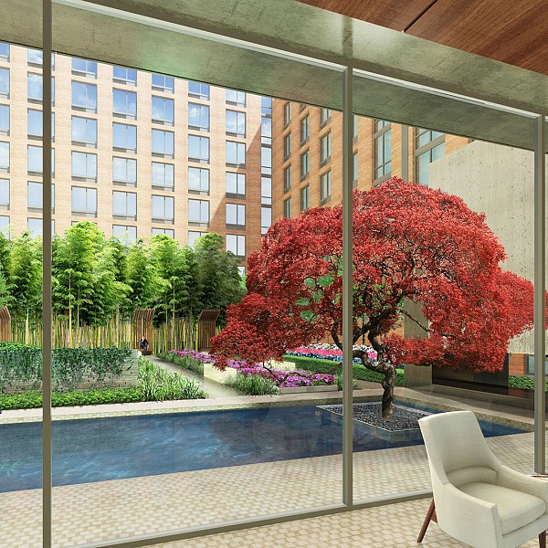 Captions: 01: Courtyard rendering, 02: Interior view of courtyard rendering, 03: View of pool in courtyard rendering, 04: Lobby rendering, 05: Reception rendering