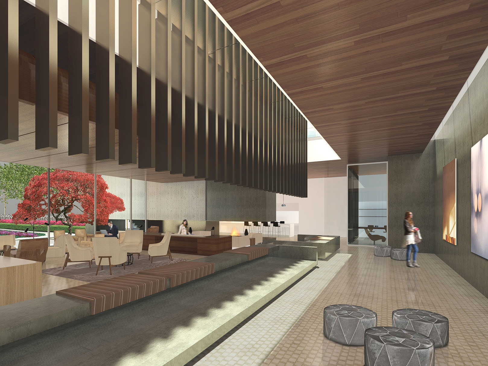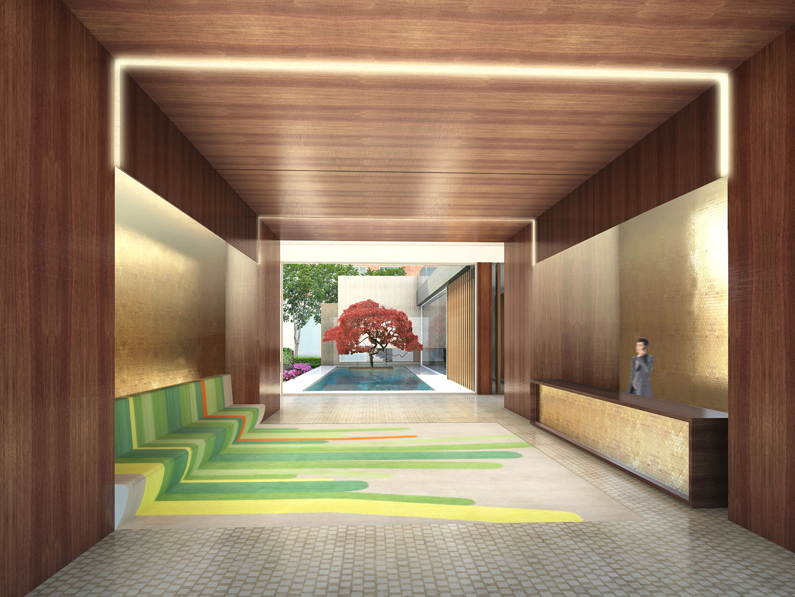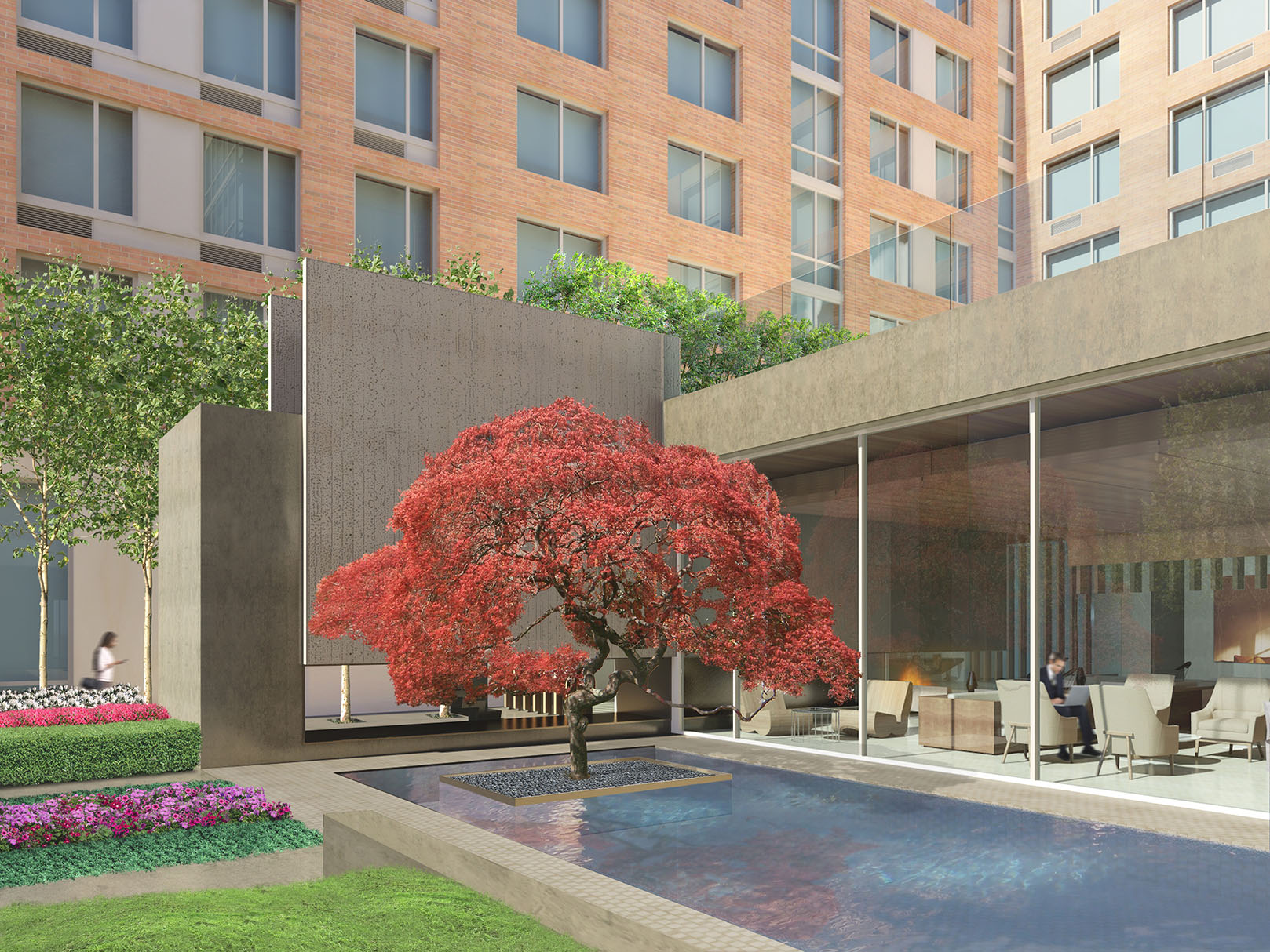 Captions: 01: Courtyard rendering, 02: Interior view of courtyard rendering, 03: View of pool in courtyard rendering, 04: Lobby rendering, 05: Reception rendering